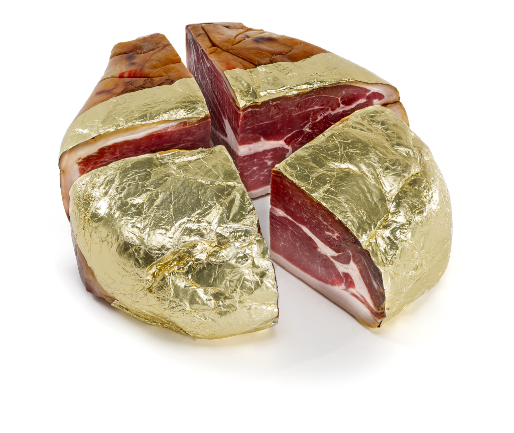 Prosciutto crudo stagionato, disossato, pressato e suddiviso in tre o quattro parti per avere dei pezzi più piccoli.
