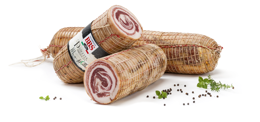 Classica pancetta senza cotenna arrotolata a mano e insaporita con la nostra antica ricetta.